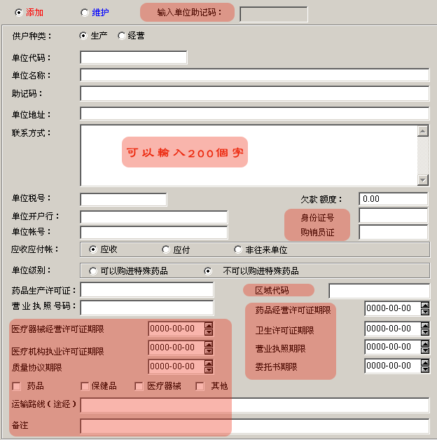 1.首营企业:(红色区域为新增功能点,以下雷同):单位名称可以输入50个汉字,助记码自动生成。