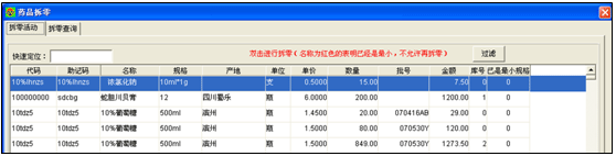 在“快速定位”那里找到要拆零的品种,双击该品种即可进行拆零操作。 比如要拆“阿托品片”,见下图: